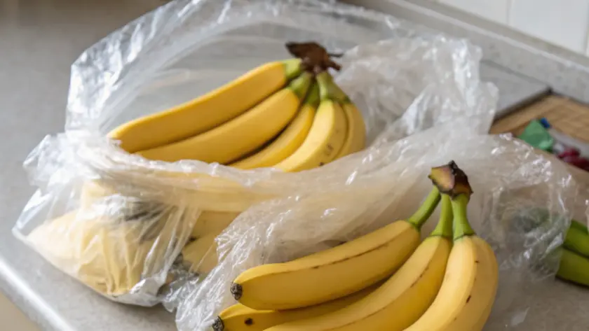 - Conservare le banane in sacchetti di plastica o chiusi ermeticamente: così intrappoli l’umidità e il gas che accelera la maturazione.